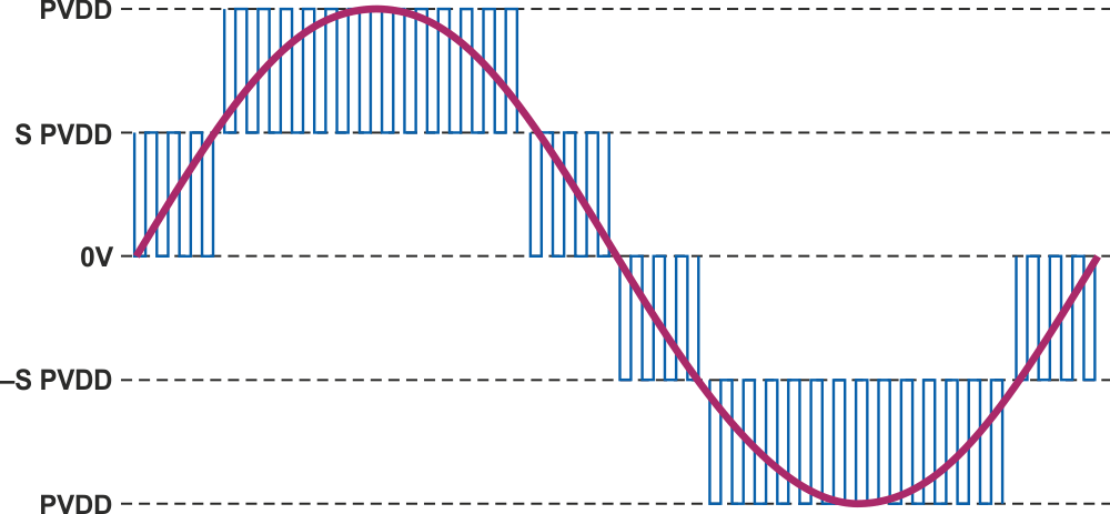 Поскольку результирующая выходная частота выше, а отдельные ступени напряжения меньше, это намного лучше приближает выходной аудиосигнал к входному сигналу, чем обычные усилители класса D.