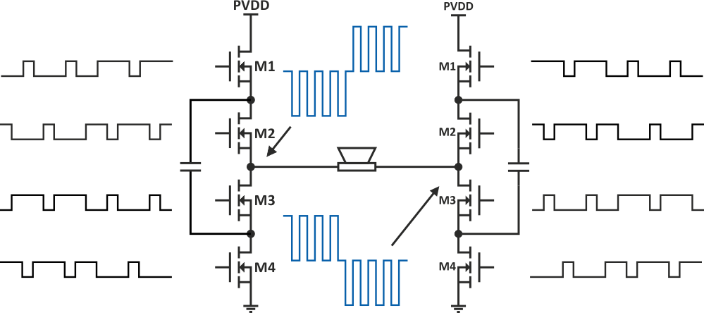 В этом случае частота переключения в нагрузке в четыре раза превышает частоту переключения MOSFET в выходных узлах полумостов. Заметьте, что схема переключения дает три состояния (в отличие от одного в обычном усилителе класса D), где происходит полное подавление остаточных внеполосных шумов переключения, а именно при –½ PVDD, 0 В и +½ PVDD. В этих точках выходы двух полумостов либо оба равны 0 В, либо оба имеют идеально «зеркальные» выходные коэффициенты заполнения 50%.