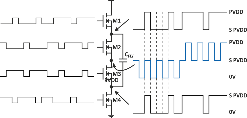 Полумост устанавливает несколько выходных уровней ШИМ от одного источника. Каждый полумост содержит четыре MOSFET (на Рисунке 4 они обозначены M1 … M4), и каждый MOSFET управляется индивидуальным ШИМ-сигналом. Конденсатор CFLY, который «плавает» между верхним и нижним MOSFET, постоянно заряжается отдельной схемой, поддерживающей на нем неизменный потенциал. Поэтому «плавающий конденсатор» функционирует, по существу, как дополнительная шина питания. Таким образом, каждый полумостовой силовой каскад формирует в выходном коммутационном узле трехуровневый выходной сигнал: 0 В, ½ PVDD и PVDD.