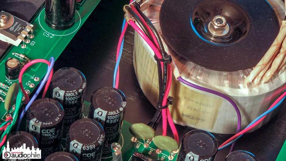 Электроника. Розетка IEC с предохранителем, выключателем и фильтром. Тороидальный трансформатор 300 Вт 2×17 В, два диодных моста 25 А, 4x 22000 мкФ / 35 В. Резервный источник питания (трансформатор 3 Вт, 12 В) включает реле, управляемое от селектора входов. Там 3 селектора входа на реле, управляемые поворотным переключателем.