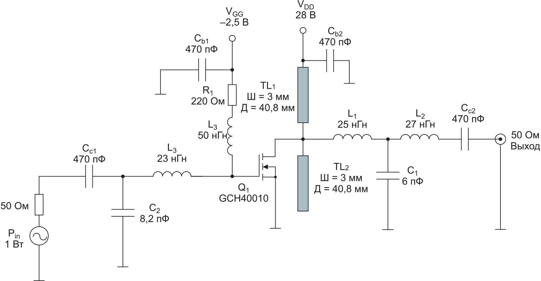 Представленная на рис. 14 схема усилителя мощности была промоделирована с помощью симулятора гармонического баланса из пакета программного обеспечения ADS.