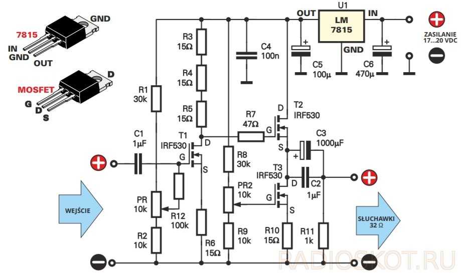 Вот схема для создания полноценного усилителя для наушников на основе полевых транзисторов, работающих также в классе A. Питание однополярное, сам УНЧ требует +15 В (с учётом падения напряжения на стабилизаторе берем 17-20 вольт.