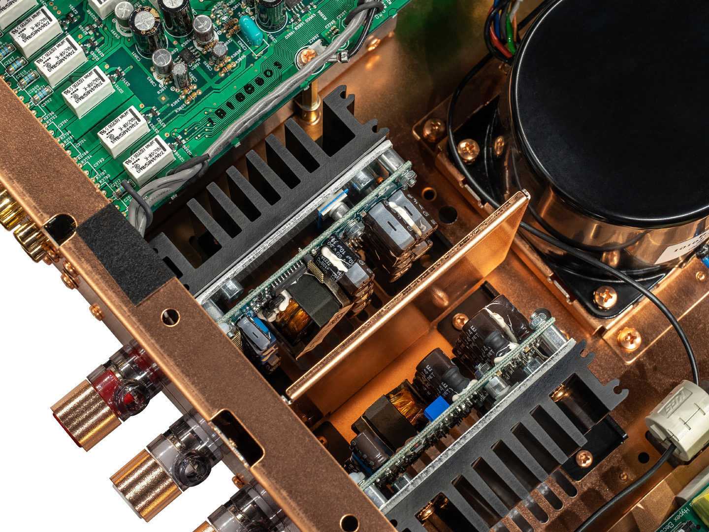 Более того, разработчики имеют возможность гораздо свободнее экспериментировать с блоками питания, управляя характером и динамикой звучания путем подбора рабочих характеристик трансформатора и конденсаторов. Например, можно установить трансформатор с многократным запасом мощности, чтобы на пиках сигнала он не выходил из оптимального режима работы, или использовать улучшенные конденсаторы, способные мгновенно отдавать высокий ток.