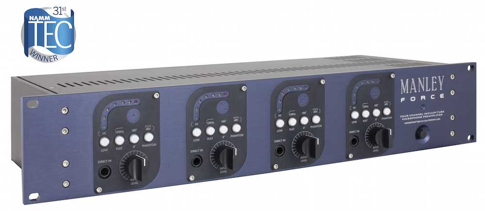 Компания из США Manley Laboratories, Inc. особо выделяет, что все исследования и разработки, сборка, тестирование и контроль качества выполняются с «точностью и гордостью» на заводе Manley, расположенном в 35 милях к востоку от Лос-Анджелеса. Из ее линейки предусилителей посмотрим модель Manley Force Four Channel Mic Preamp, уже название которого сообщает, что аппарат имеет четыре входа с отдельным усилителем на каждый и выполнен на лампах. Так что истинные любители «мягкого» лампового звука будут довольны.
