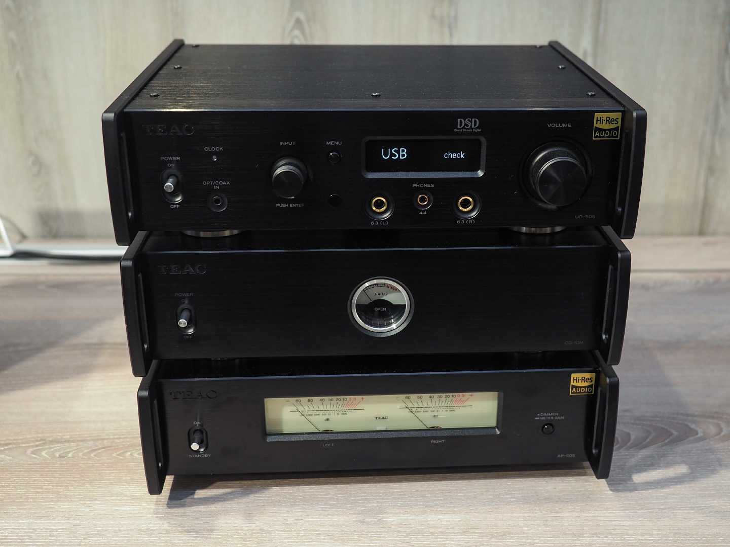 Снизу вверх: усилитель мощности TEAC AP-505, клок TEAC SG-10M и ЦАП-пред и он же усилитель для наушников TEAC UD-505