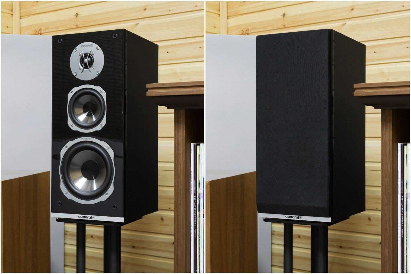 Корпуса с лаконичным ностальгическим дизайном имеют отделку с фактурой деревянного шпона – чёрного дуба и грецкого ореха. В комплекте две пары грилей из грубой ткани разного цвета в классическом скандинавском стиле.