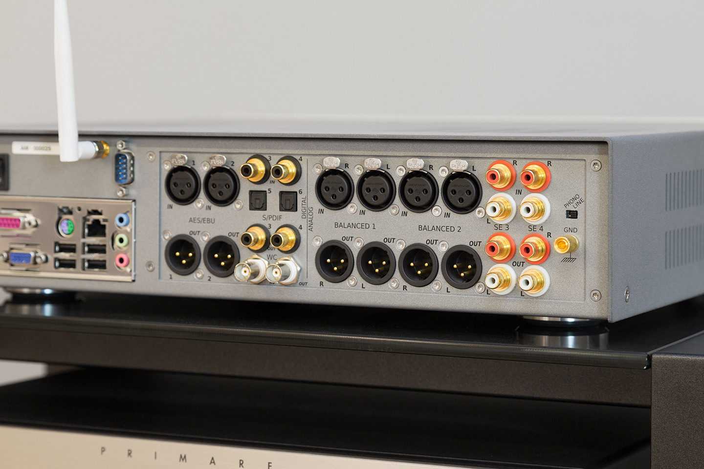 Аналоговая часть имеет балансные и небалансные входы и выходы. Один из небалансных входов может направлять сигнал во встроенный фонокорректор. Сам фонокорректор гибридный, низкочастотную часть диапазона выравнивает аналоговым способом по традиционной схеме RIAA, а верхнюю половину диапазона частот обрабатывает уже в цифровом виде. Ценители аутентичного аналогового звука могли бы возмутиться подобной вольности. Но не будем забывать, что в Trinnov Amethyst это в принципе цифровой процессор, и любой попавший в него аналоговый сигнал рано или поздно оцифровывается с качеством 24бит/96кГц, после чего проходит цифровую обработку. Поэтому, каков бы ни был источник, в итоге речь все равно идет о цифре.
