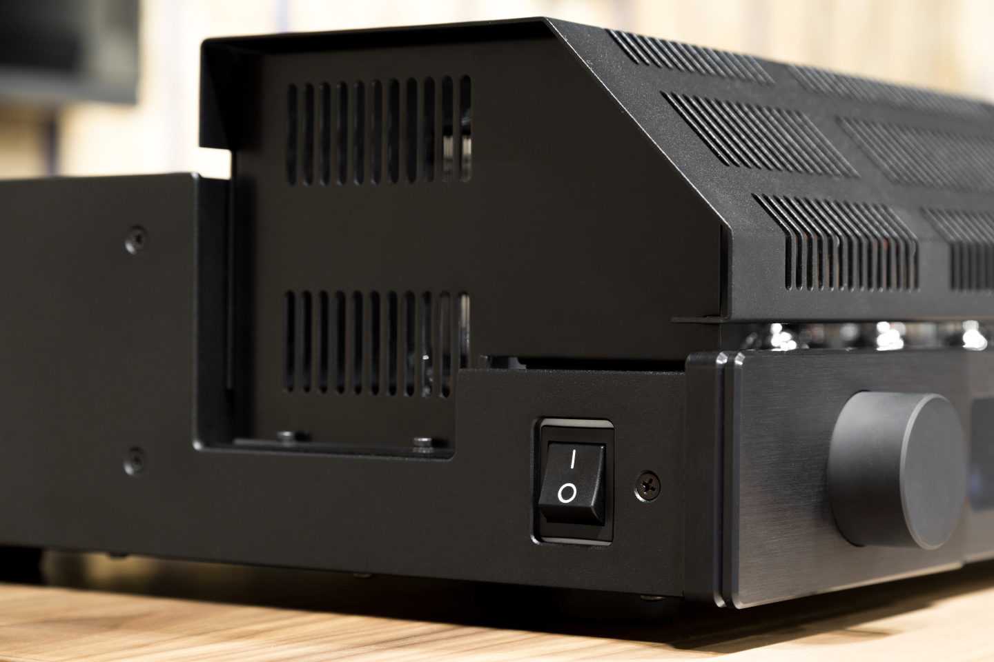 Внешне усилитель производит двоякое впечатление, но только за счет одного-единственного элемента конструкции, а именно — защитной крышки. С крышкой аппарат, будь он в черном цвете или в серебристом, выглядит немного устрашающе… Хотя я попробовал представить, как бы это можно было изменить. Пожалуй, что никак, не переделав дизайн полностью. Сама же по себе крышка сделана наилучшим образом с точки зрения защиты — прочная, с надежными винтовыми креплениями и даже с предусмотренной защитой от царапин корпуса. Иначе говоря, если лампам полагается защита (а европейское законодательство это жестко регламентирует), то крышка эту защиту обеспечит точно так же, как и полностью закрытый корпус. Никаких полумер и лукавства с сеточками. Но что радует — если эту самую крышку снять, то перед нами оказывается очень изящный (но в то же время лаконичный) усилитель, с отлично выдержанными пропорциями и с алюминиевым корпусом отменного качества.