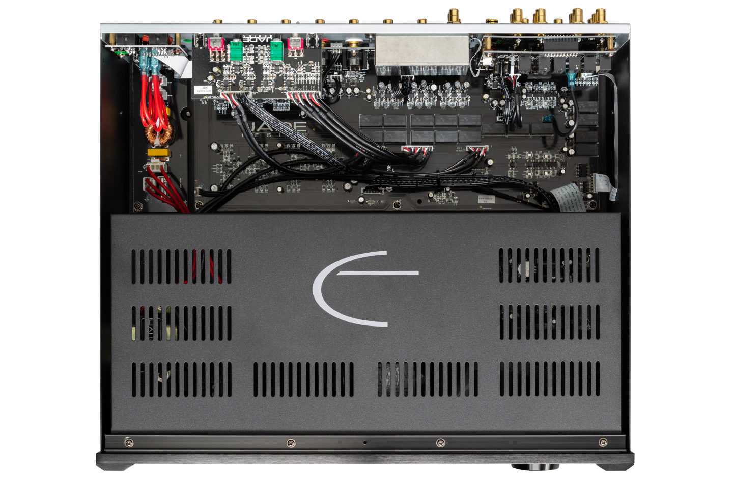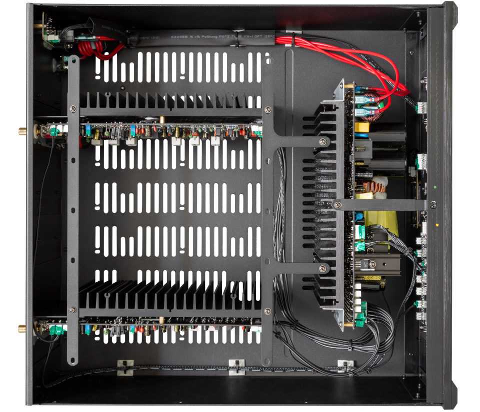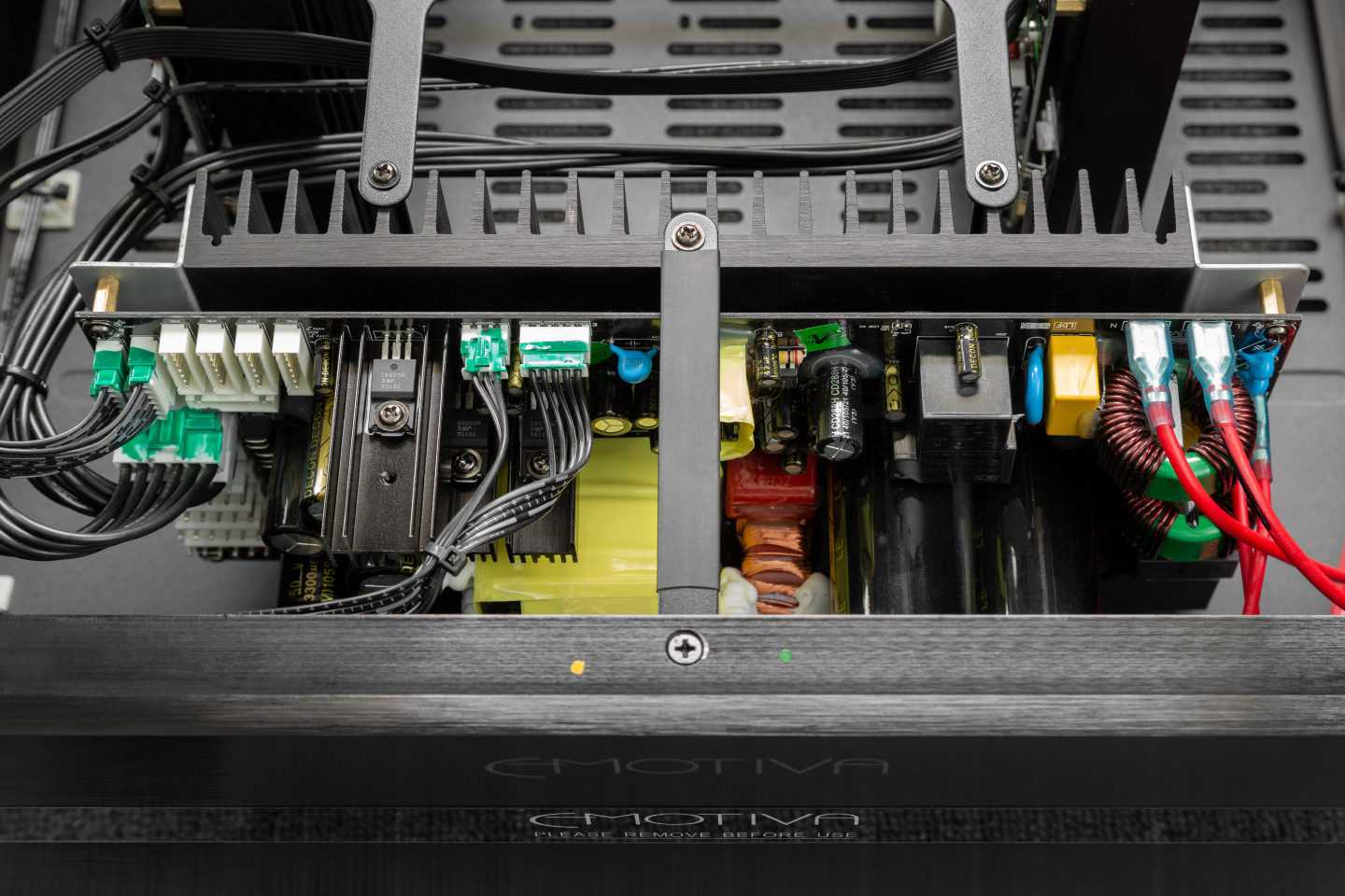 Emotiva XSP-1 со снятой основной крышкой. Половина корпуса с расположенным там блоком питания закрыта вторым кожухом