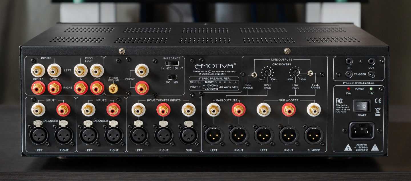Если изучить функционал Emotiva XSP-1, то он окажется не совсем обычным. Помимо традиционных линейных входов/выходов (балансных и небалансных) и фонокорректора, есть еще сквозная петля и расширенные возможности для подключения сабвуферов — можно подключить один саб на все или по штуке на каждый канал. Также присутствует регулировка частоты среза в диапазоне 50-250 Гц.