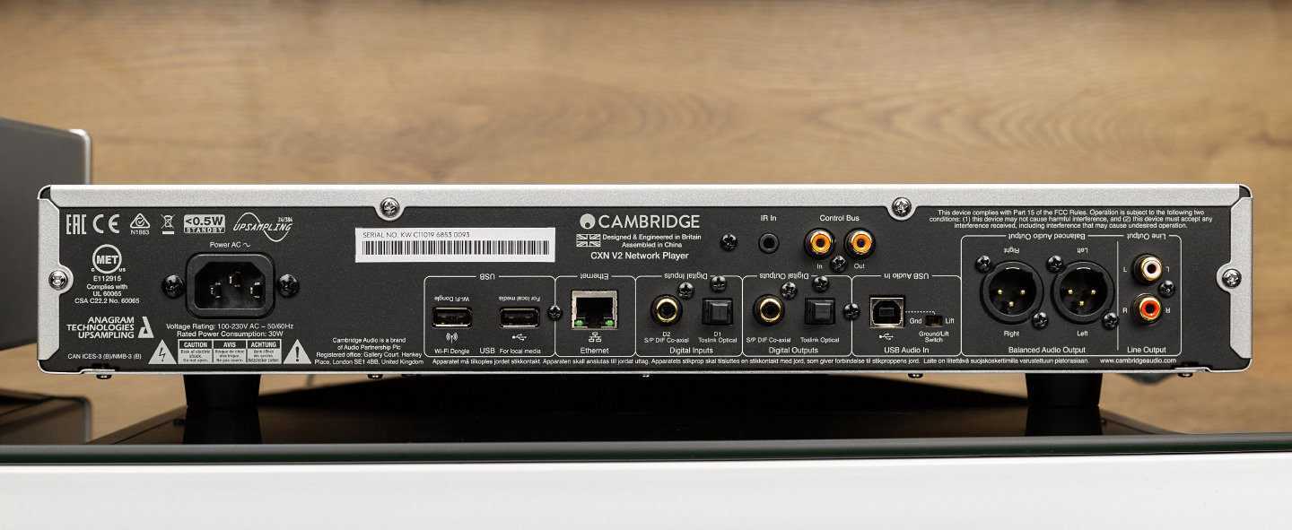 Обратная сторона усилителя демонстрирует здоровое дополнение физических соединений для подключения к этому улучшенному USB-входу. На аналоговой стороне есть четыре входа RCA и сбалансированный XLR; Компания Cambridge решила отказаться от фонофонического входа, но внешний фонофон, такой как собственные модели компании Alva, станет хорошим партнером для тех, кто хочет подключить проигрыватель.