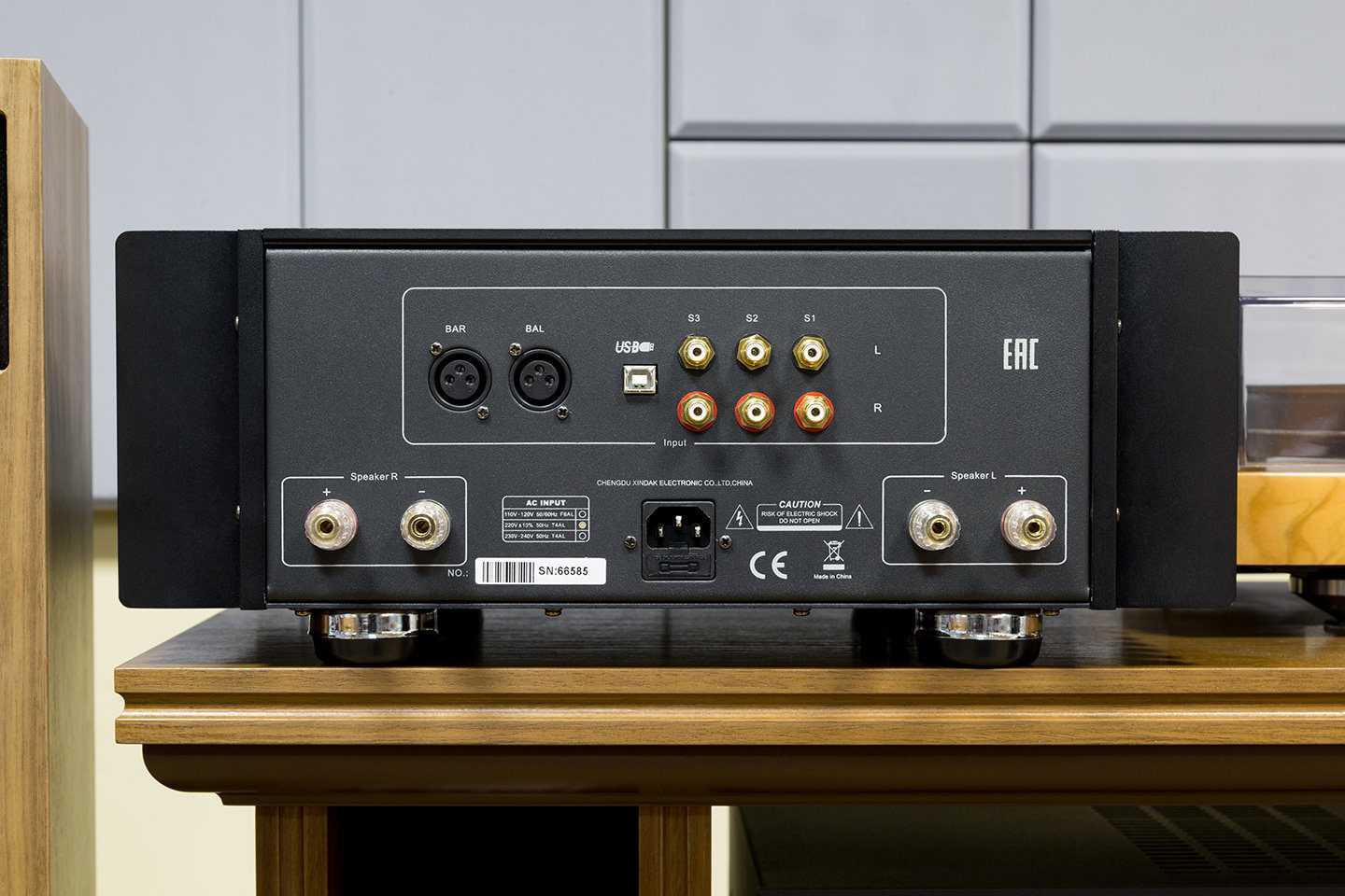 По управлению и коммутации усилитель прост и удобен. Передняя панель с кнопками и единственной ручкой интуитивно понятна. Разве что синие светодиоды по традиции поругаю: сделай компания ненавязчивые желтоватые или белые — смотрелось бы куда лучше. А так все переключается, крутится, с пульта управляется — и сложно ожидать чего-то еще. Темброблока нет, и это только к лучшему. Входов у усилителя пять: три небалансных, один балансный и тот самый цифровой USB. Правда, балансный вход скорее нужно назвать XLR-входом, потому что соответствующие разъемы есть, но именно балансной схемотехники в полноценной реализации я не нашел.