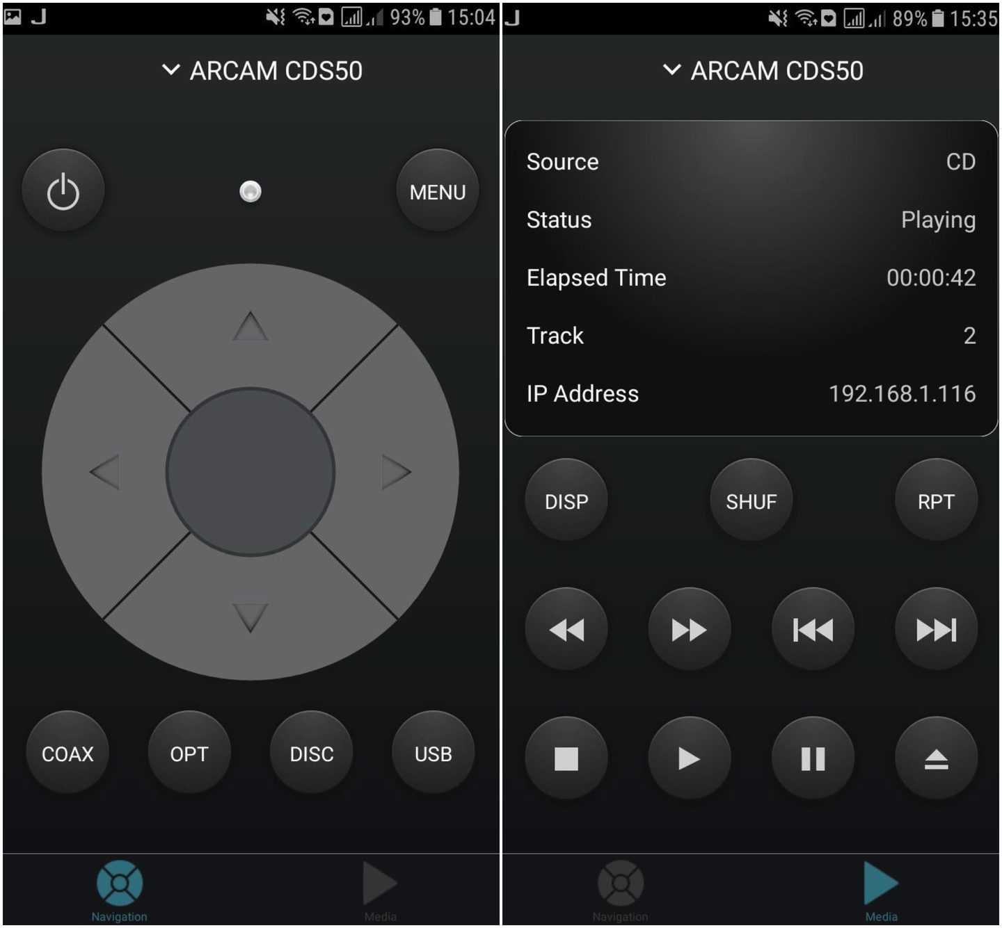 Кроме пульта ДУ, предлагается управляющее ПО для устройств Android и Apple. Оно состоит из двух частей: Arcam Control, по сути, дублирующее работу пульта, и Music Life, предназначенное для управления фонотекой и потоковым воспроизведением (в данном случае с универсального плеера CDS50). Этот источник оснащен 32-битным ЦАПом Sabre ESS9038K2M и играет все форматы музыкальных дисков, а также большинство распространенных файлов — по сети и с подключенных USB-носителей.