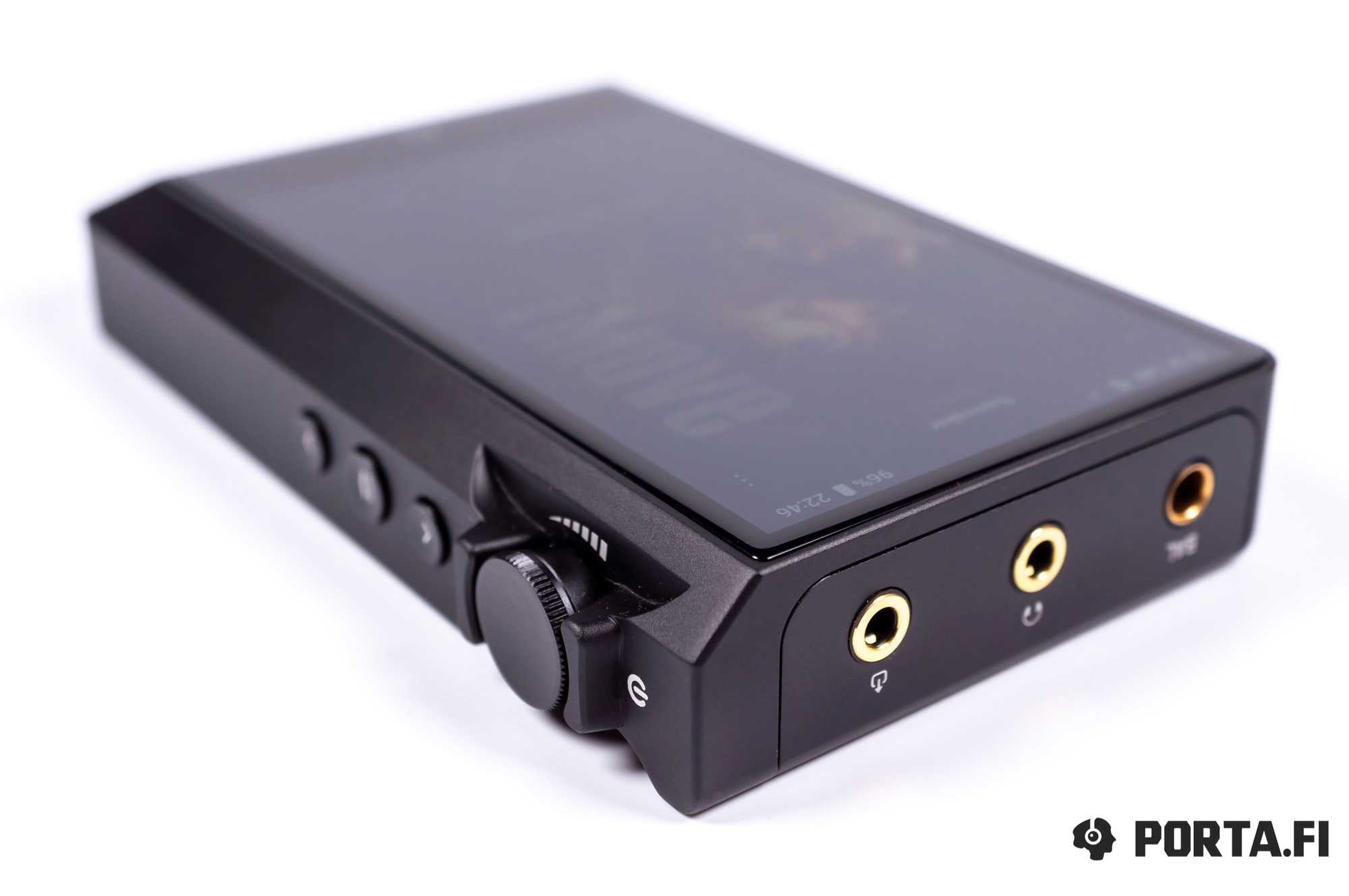 Большую часть верхнего торца занимает панель сменного аудиомодуля с разъёмами, в штатном варианте это обычный и линейный выходы с 3.5 мм гнёздами, а так же Pentaconn балансного выхода. Вполне вероятно, что другие модули будут предлагать другой набор интерфейсов. Для замены модуля надо просто выкрутить пару винтов на задней стороне плеера, удерживающих его.