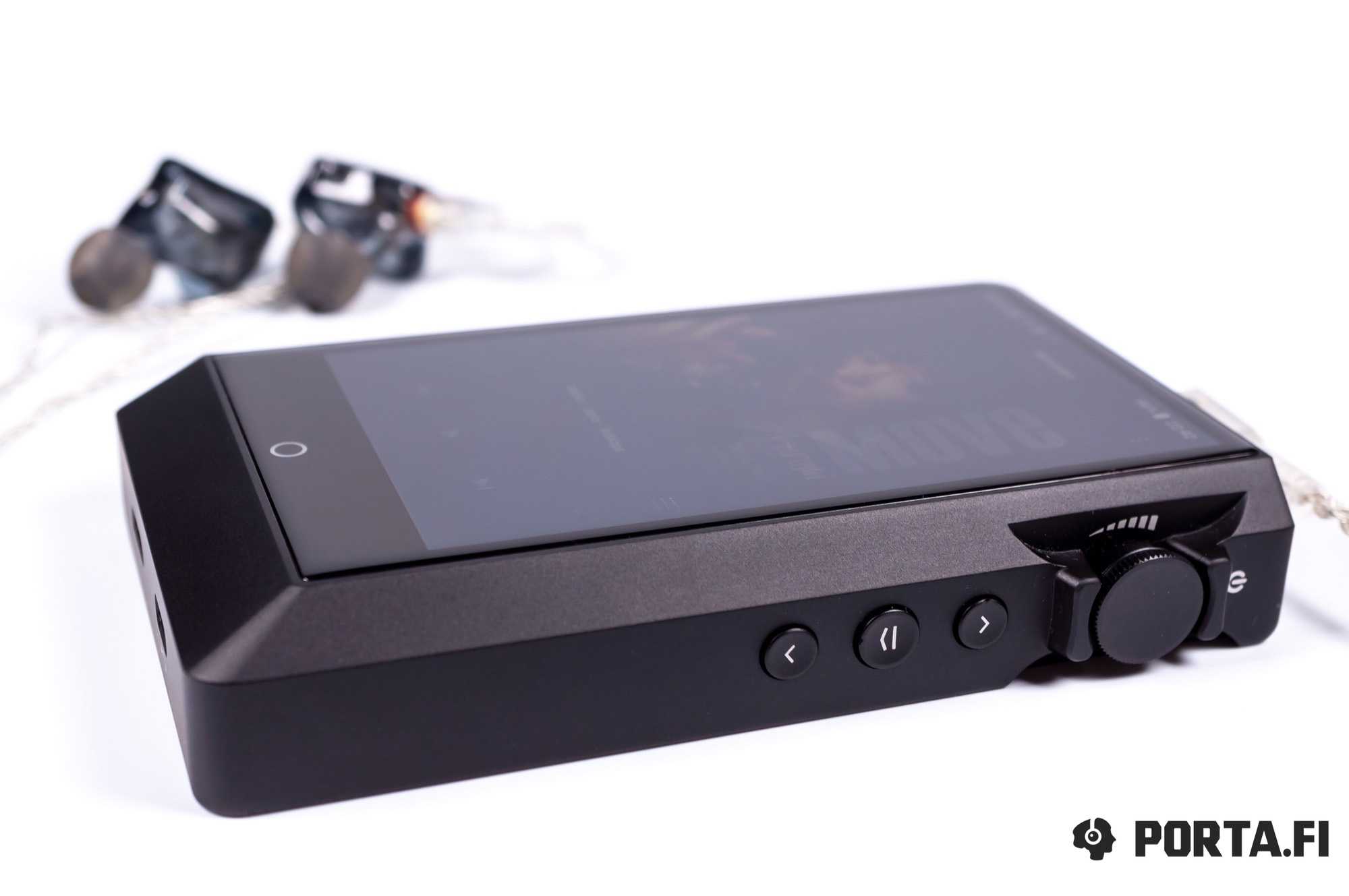 Органы управления: четырехкнопочный «джойстик» на передней панели, качелька громкости на правой грани, поворотно-нажимное колесо на левой стороне и клавиша питания наверху. На верхней грани выходы плеера: линейный, для наушников, и коаксиальный. На нижней грани имеется порт для microSD, отверстие с кнопкой сброса, светодиодный индикатор зарядки и разъем microUSB. Отдельных кнопок для управления воспроизведением на ощупь нет – их функции реализованы с помощью имеющихся элементов. Так функция старт/стоп выполняется при нажатии на колесо, а переключать треки можно с помощью долгого нажатия на качельку регулировки громкости.