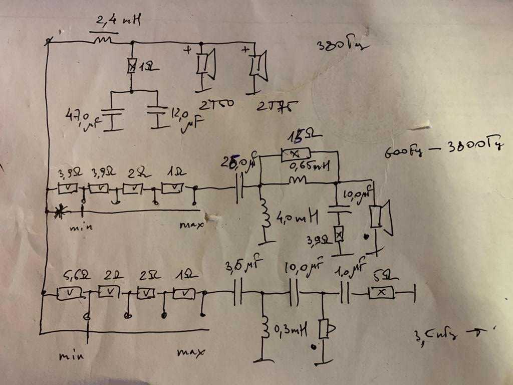 В соответствии с заводской схемой и имеющимися в схеме комплектующими, по их расчетам, получалось, что нижний порог 384 герц, середина от 800 до 2000 герц, а высокочастотник от 3000 герц должен был играть. А он вообще не играл – отдельная тема.