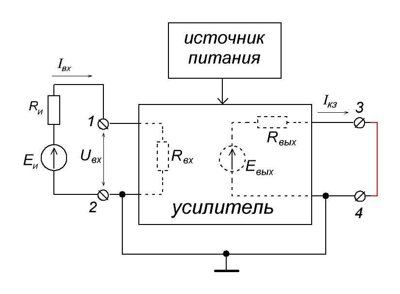 Немного иначе обстоят дела с выходным сопротивлением. В теории, можно замкнуть выходные клеммы 3 и 4 накоротко. В этом случае во выходной цепи усилителя у нас появится ток короткого замыкания Iкз