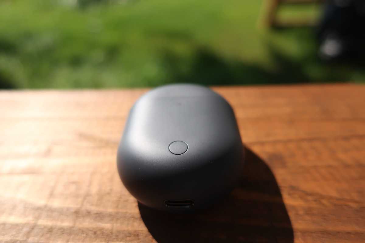 Кейс овальный, компактный, по ощущениям – чуть больше футляра AirPods. Снизу расположен USB-C-разъем для заряда, на лицевой части – светодиодный индикатор и физическая кнопка сопряжения с устройствами.
