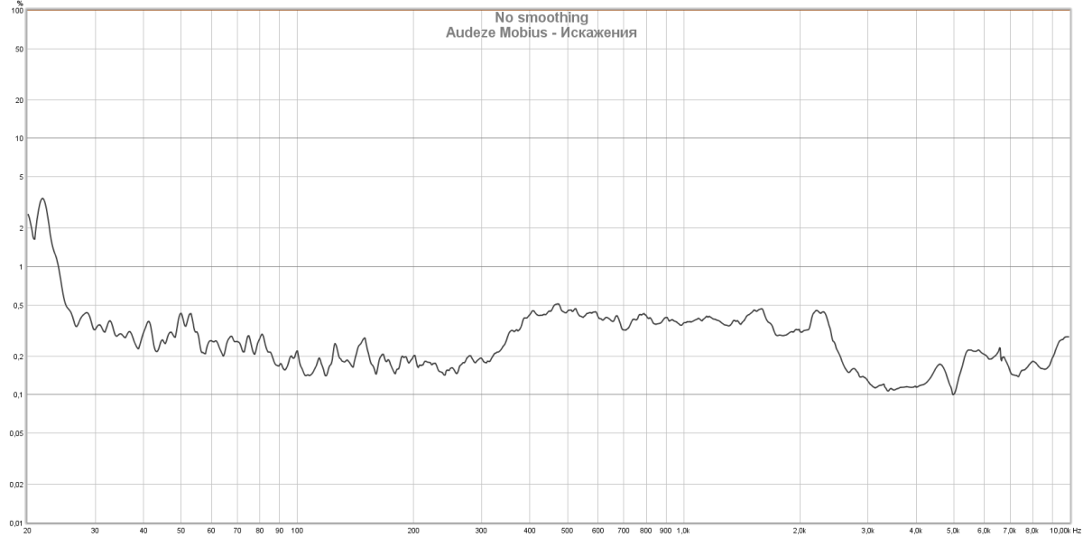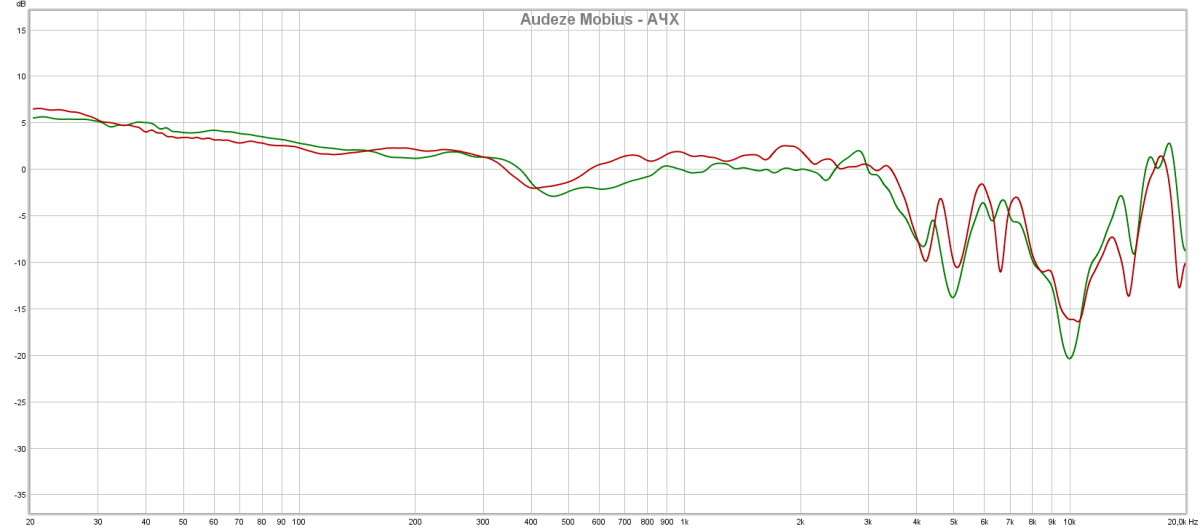 Средняя линия АЧХ имеет умеренный уклон в зоне баса и нижней середины, а в области верхней середины стремится к линейной. В отличие от пассивных планарно-магнитных моделей, Audeze Mobius не имеет глубоких провалов в нижней части ВЧ- диапазона.