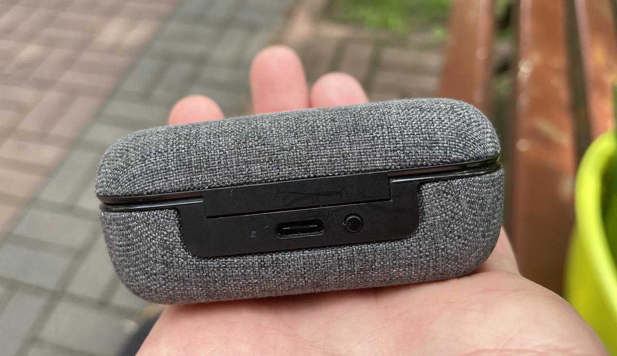 На задней стенке кейса расположились разъем USB-C, светодиод, отображающий состояние заряда, и кнопка, которая этот светодиод включает. Лампочка светится тремя цветами: зеленым, желтым и красным. Батареи кейса хватит, чтобы подзарядить наушники дважды, сами же наушники живут на одном заряде до четырех часов. Суммарно выходит около 12 часов.
