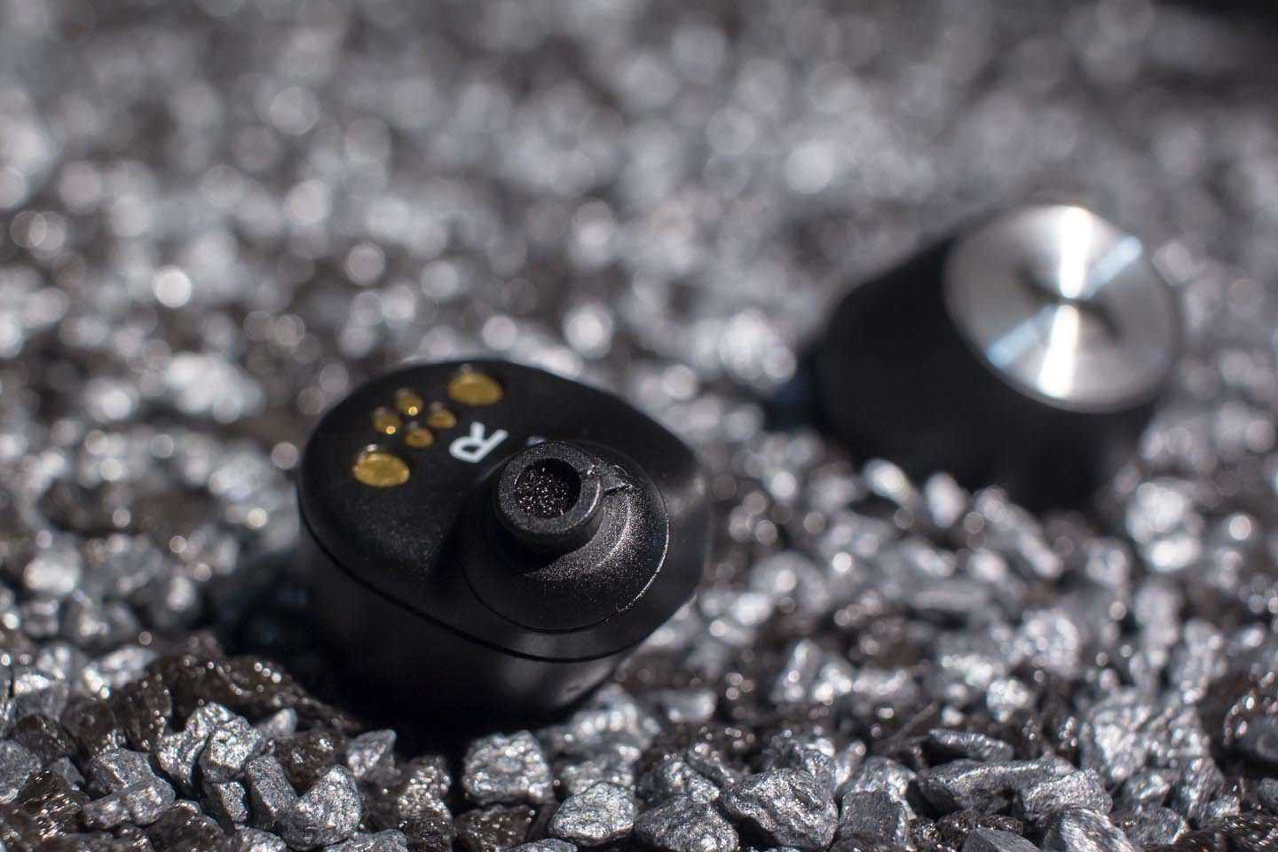 Как и внутреннее покрытие кейса, большая часть капсюлей выполнена из качественного матового чёрного пластика. На каждом корпусе имеется индикатор, клеммы для зарядки, датчик приближения, который используется в работе «умной паузы» и обозначение L или R. Также на боковых гранях и на верхней (на правом наушнике) можно заметить отверстия микрофонов для ANC и разговоров.