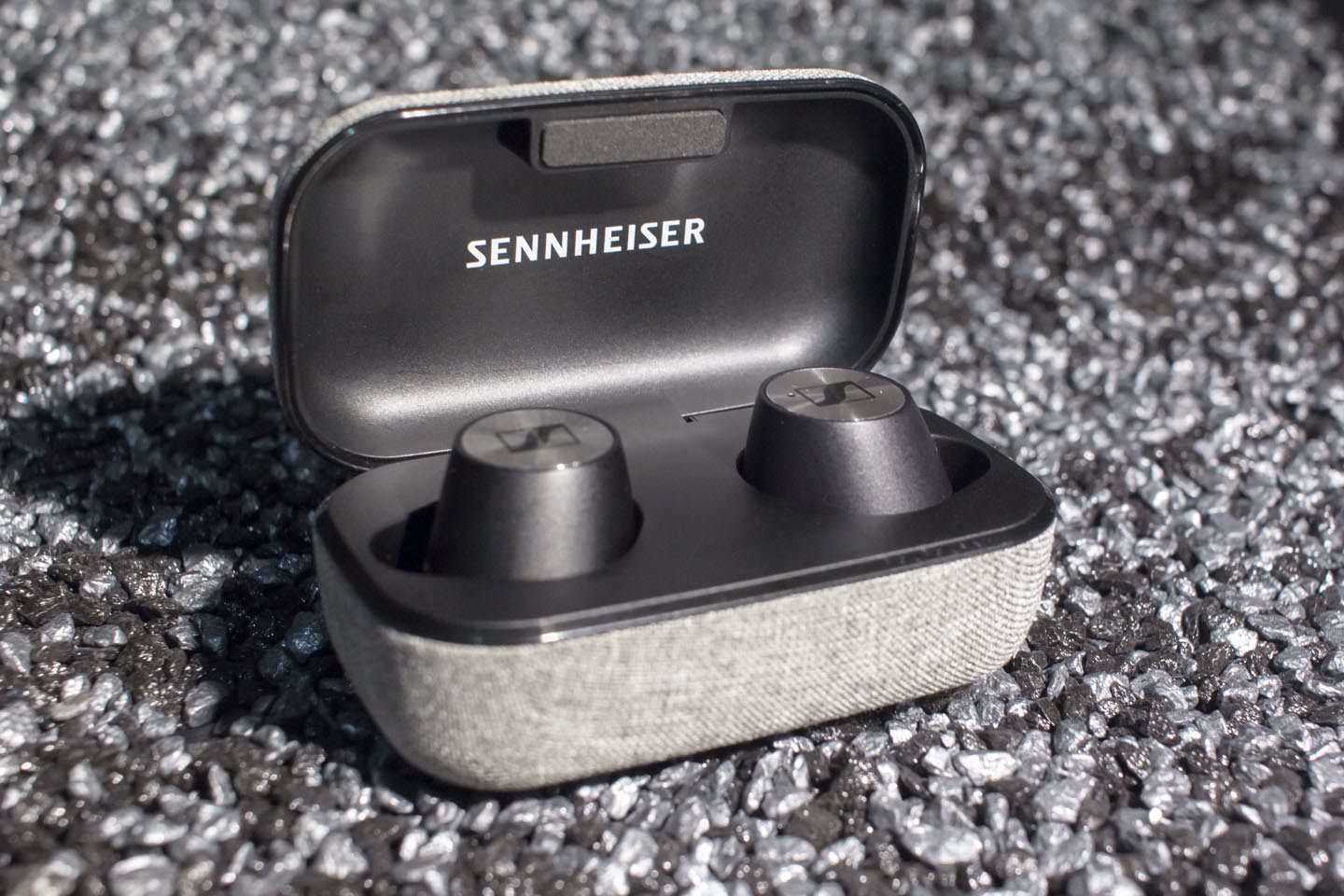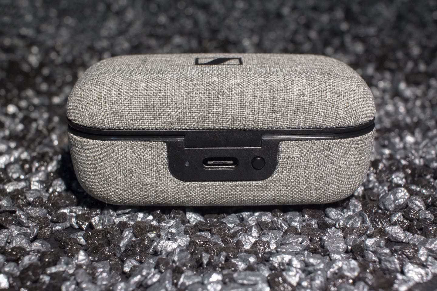 В первую очередь, я хочу пройтись по дизайну. В комплекте с наушниками идет кейс, оклеенный серой рогожкой в стиле минималистичных тканей Kvadrat (но, кажется, производитель ткани все-таки другой). С рогожкой соседствует плотный, жесткий, матовый черный пластик — и этим же пластиком оформлен кейс изнутри. Верхняя крышка кейса украшена логотипом Sennheiser снаружи и именем бренда изнутри.