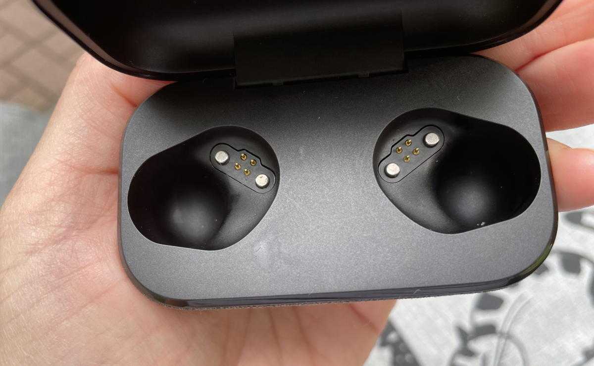 Наушники влетают в посадочные места с легким «чпоком», примагничиваясь достаточно крепко. Заряжаются они через контактные площадки, без штырьков. Крышка кейса тоже магнитная.