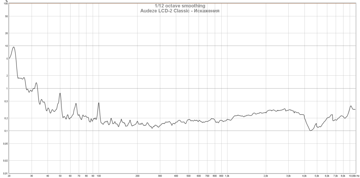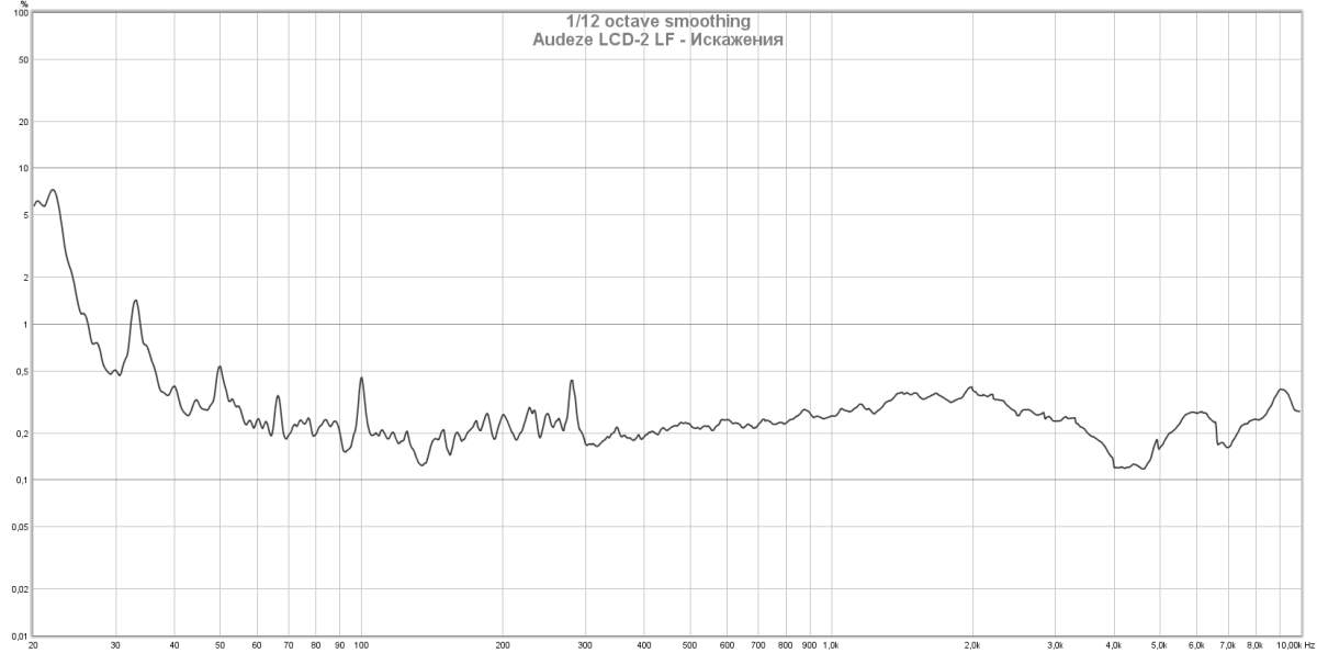 И LCD-2 Leather Free, и LCD2 Classic продемонстрировали исключительно низкий уровень искажений. В основной части график проходит вдоль отметки -0,2%, а поднимается он не выше -0,5%, за исключением области нижнего баса. Локальные всплески, заметные при сглаживании 1/12 октавы, говорят о том, что даже мощному Schiit Ragnarok работать с наушниками не так уж легко.
