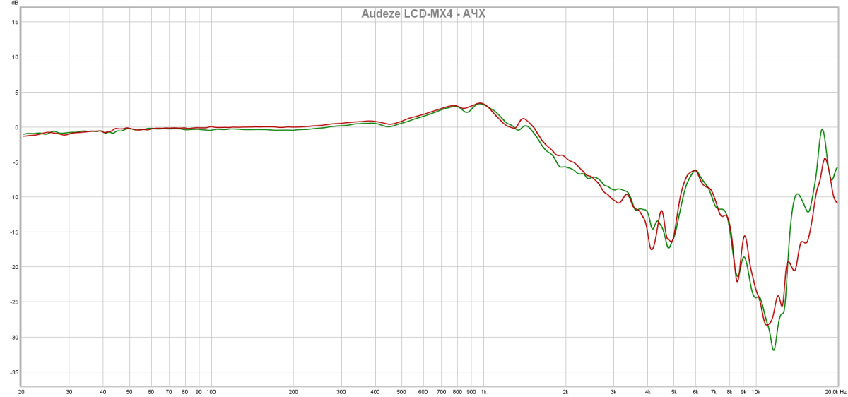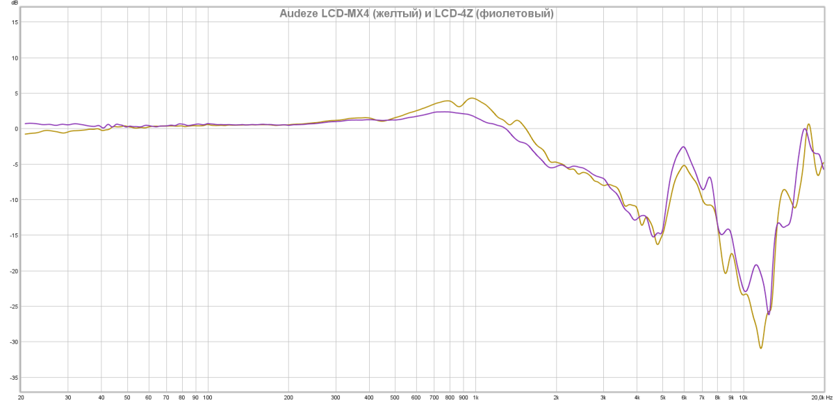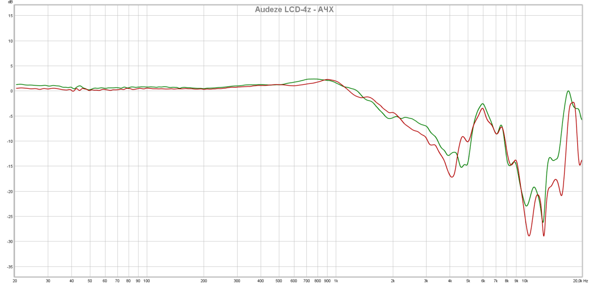 У LCD-4z АЧХ оказалась более линейной, а ее форма практически идентичная обычной версии LCD-4. Важным отличием от LCD-MX4, помимо формы АЧХ, является идентичность каналов. У LCD-4z первое хоть сколько-нибудь заметное расхождение появляется на отметке порядка 550 Гц, а у LCD-MX4 только на 2000 Гц.