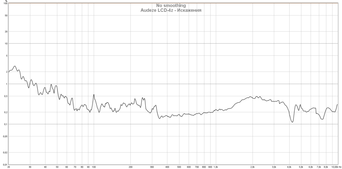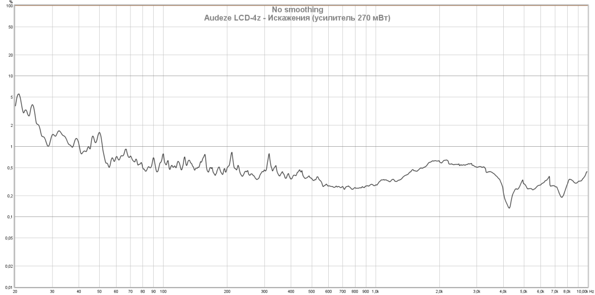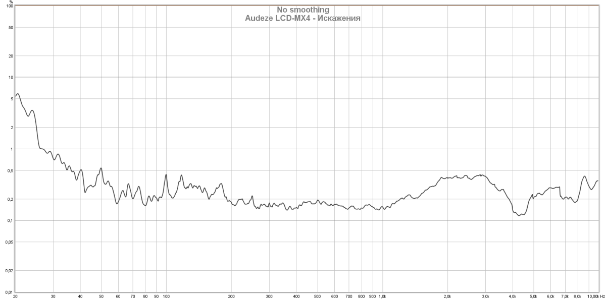Графики искажений в обоих случаях укладывается в коридор 0,1-0,5% за исключением нижнего баса. При желании можно разглядеть небольшое превосходство LCD-MX4, хотя в целом обе модели одинаково хороши. Однако эти данные были получены с помощью мощного усилителя Schiit Ragnarok, выдающего на 15-20 Ом более 15 Вт мощности.
