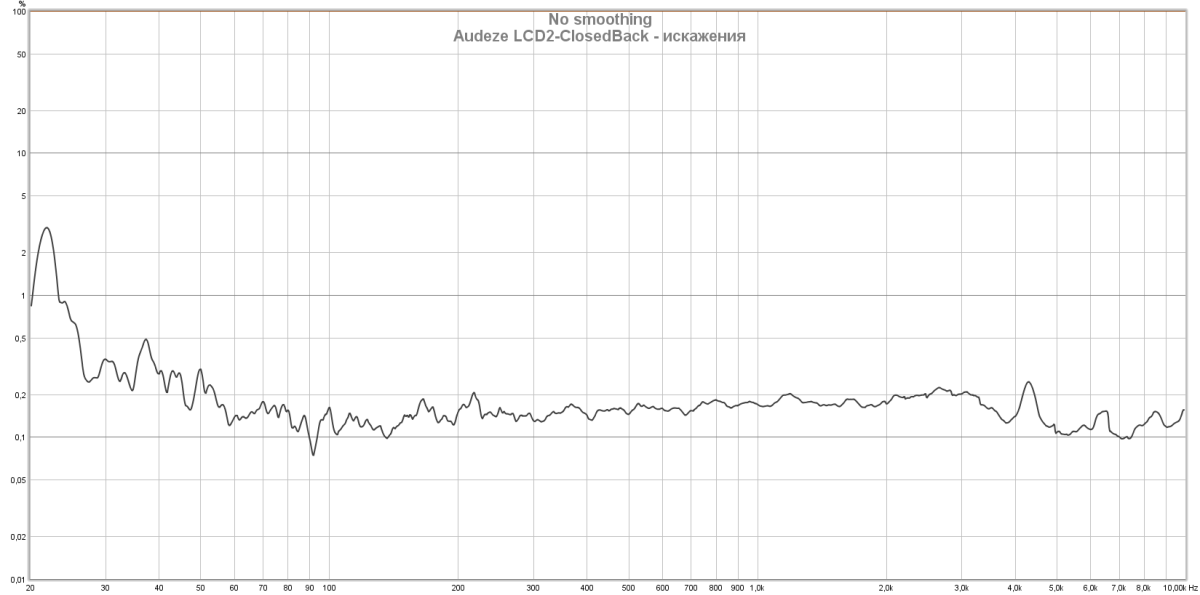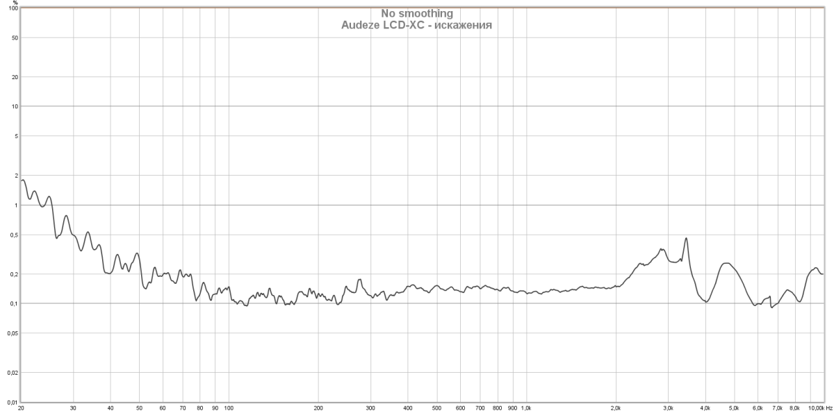 В обоих случаях основной диапазон частот воспроизводится с искажениями, укладывающимися в коридор 0,1–0,2%. Но у модели LCD-XC есть локальный подъем графика в области 3 кГц, совпадающий с провалом АЧХ в этой же области. Кроме того, у LCD-XC раньше происходит нарастание искажений в басовом диапазоне. В целом же обе модели демонстрируют отличные результаты, не отличающиеся принципиально от открытых версий наушников серии LCD.