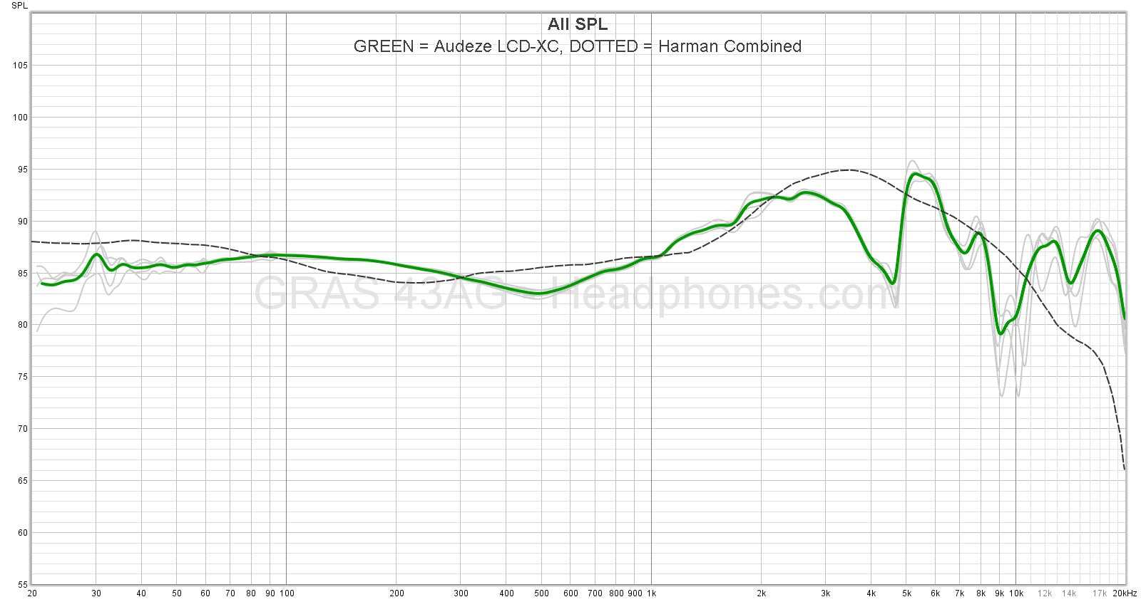 The following is how the Audeze LCD-XC measures on the GRAS 43AG standardized measurement rig relative to the combined Harman target curve (Harman 2013 bass but Harman 2018 mids and treble). For reference, the Harman 2018 bass is substantially elevated — far too much for what I think most audiophiles would consider appropriate, even if some bass heads may like it, so I prefer to use the more modest 2013 bass shelf. In any case, these are raw measurements, meaning it should not look like a flat line across. This instead shows the raw measurement relative to the target that would otherwise be normalized in compensated measurements.
