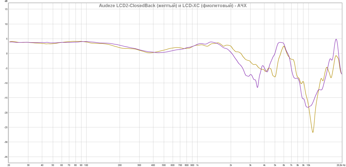 Частотная характеристика LCD-XC на СЧ/НЧ имеет схожую форму. Но все же она более линейна в нижнем и среднем басе, а прогиб в СЧ-диапазоне смещен несколько выше по частоте. Провалы АЧХ на 3 и 10 кГц у этой модели оказались глубже и шире, чем у LCD2 Closed- Back.