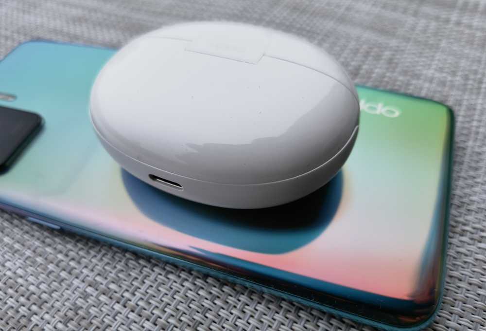 Рассмотрим футляр со всех сторон. Зарядный кейс выполнен в прямоугольной форме, при этом все углы закруглены. На фронтальной части установлена алюминиевая вставка с логотипом OPPO, также в нее встроен светодиод. Кнопка сопряжения круглая, пластиковая, находится на правой части грани. USB-C порт для зарядки расположен снизу, беспроводная зарядка отсутствует.