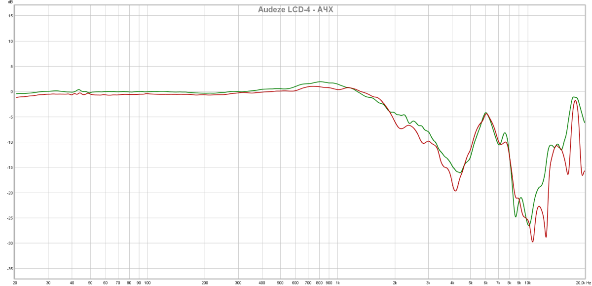 АЧХ модели LCD-4 в целом схожа с той, что мы видели на второй и третьей модели, однако есть одно существенное отличие: у старших наушников левый и правый каналы отличаются друг от друга еще меньше, чем у младших, в том числе в зоне выше 2-3 кГц. Несколько более высокого уровня я ожидал в ВЧ диапазоне, но со стендом не поспоришь.