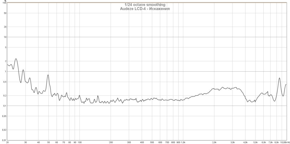 Уровень искажений предельно низок практически во всем диапазоне. На 50 Гц можно наблюдать резонанс, который имеет небольшие отражения и на АЧХ. В целом же искажения укладываются в коридор 0,1-0,5%, что для наушников более чем отличный результат.