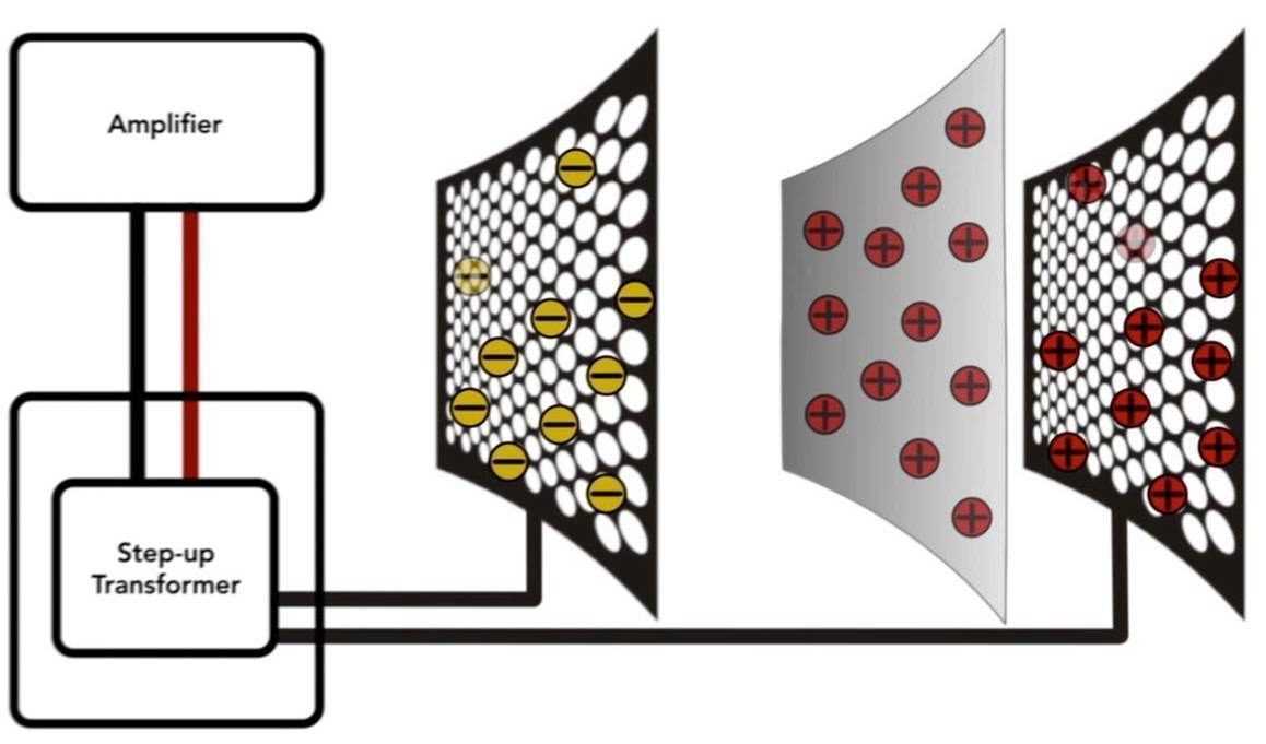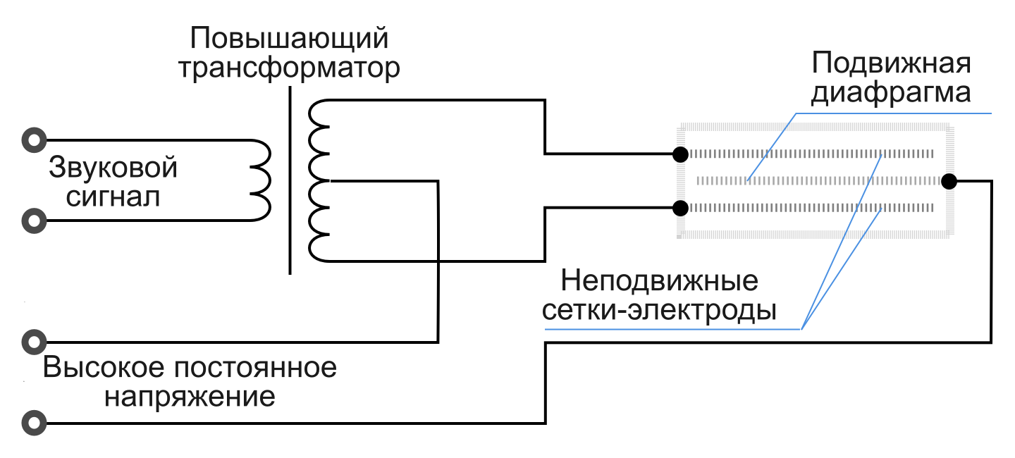 В основе конструкции электростатических устройств лежат драйверы без звуковых катушек. Мембрана заряжается электричеством и перемещается между двумя электродами в виде пластин. Вибрация диафрагмы создает воздушные потоки, которые проходят через пластины с отверстиями и превращаются в звук.