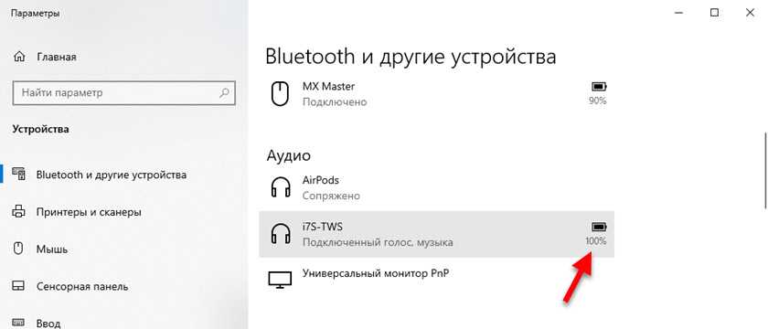 На компьютере уровень заряда батареи можно посмотреть в параметрах Bluetooth.