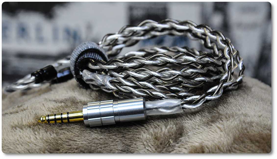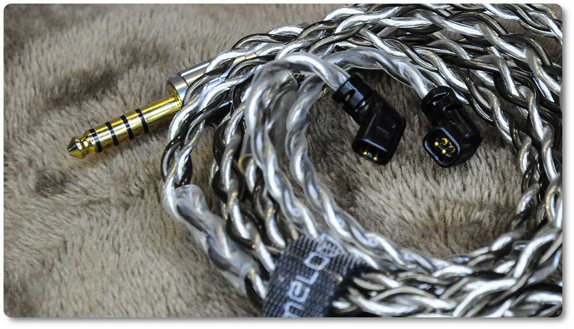 Для Unique Melody Mest кабель был разработан под заказ компанией Beat Audio. К сожалению, производитель не акцентирует на характеристиках, в частности, на материалах проводника. Но могу предположить, что это — сочетание посеребренной и чистой меди. Кабель представляет собой аккуратное плетение четырех проводников в двухцветной оплетке, прозрачной и бронзовой. Он средний по толщине и очень мягкий.