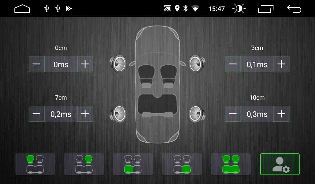 Одна из важнейших опций процессора, позволяющая настроить звуковую сцену таким образом, чтобы слушатель ощущал себя находящимся в центре зоны стереоэффекта. Для простоты настройки предусмотрены следующие варианты расположения: Водитель, Все, Пассажир, Задний левый пассажир и Задний правый пассажир. Сядьте на водительское место, выберите опцию «Водитель» и вы ощутите всю полноту звука, идентичную той, что мы получаем при прослушивании высококлассных аудиосистем дома. Также, Вы можете самостоятельно определить позицию слушателя, указав на схеме салона автомобиля его расположение или выставить значения временных задержек вручную. Для удобства настройки, задержки переведены в сантиметры (вдобавок к миллисекундам).