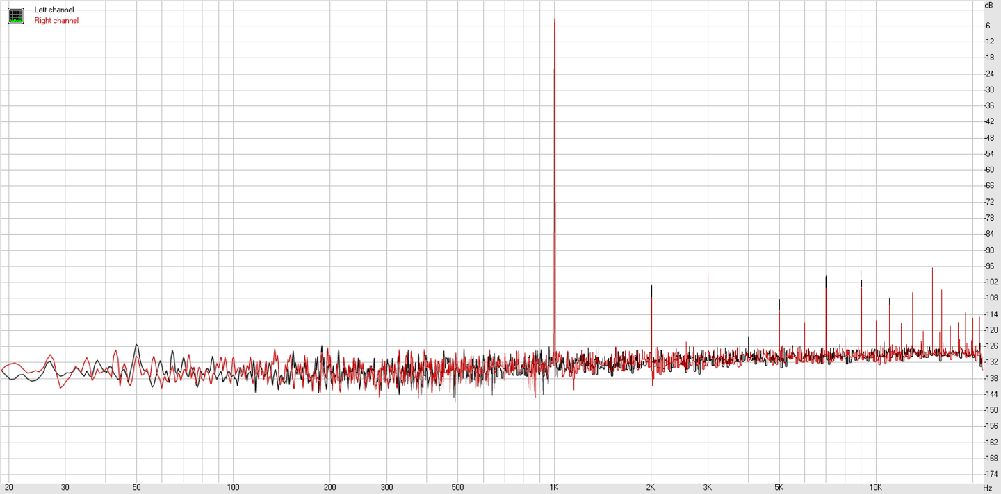 Но это общая цифра, для нас имеет значение характер распределения этих гармоник. На графике ниже видно, что они хоть и мелкие, меньше –90 дБ, но доминируют нечетные, которые торчат и на высоких порядках. В идеале было бы, чтобы основная масса их сидела во второй гармонике и пропорционально уменьшалась с ростом порядка.