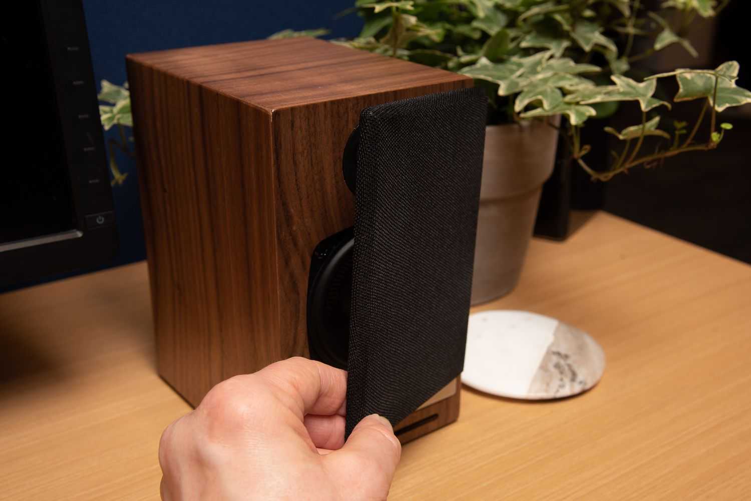 Packaging here is nothing to get excited over: simple cardboard with foam inners protects things nicely. It gets the job done. And outside of the detachable grilles, the main accessory here is the felt carry case for each speaker. It’s a small thing, but we really like it. It might just be there to protect the speaker during transit, but we liked it enough to keep it around. Obviously, we aren’t going to be moving the speakers from place to place on the regular, but it’s nice to know that if we do, we can wrap them up in soft felt, pulling the drawstring shut.