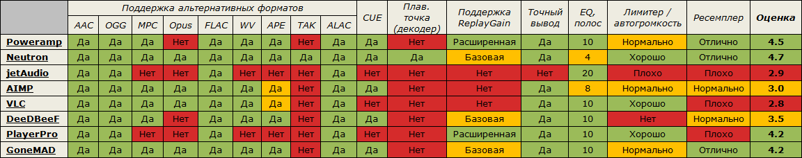 Таким образом, золото у нас получает Neutron. Он имеет все функции, необходимые для качественного воспроизведения аудио: декодирование с плавающей точкой, автокоррекция громкости; а также поддерживает все актуальные форматы (включая самые высокотехнологичные TAK и Opus). Но, справедливости ради, следует отметить некоторые недостатки этого плеера: не слишком удобный параметрический эквалайзер, отсутствие возможности максимизации громкости с помощью ReplayGain (нет настройки предотвращения клиппинга) а также множество настроек, польза от которых весьма сомнительна.