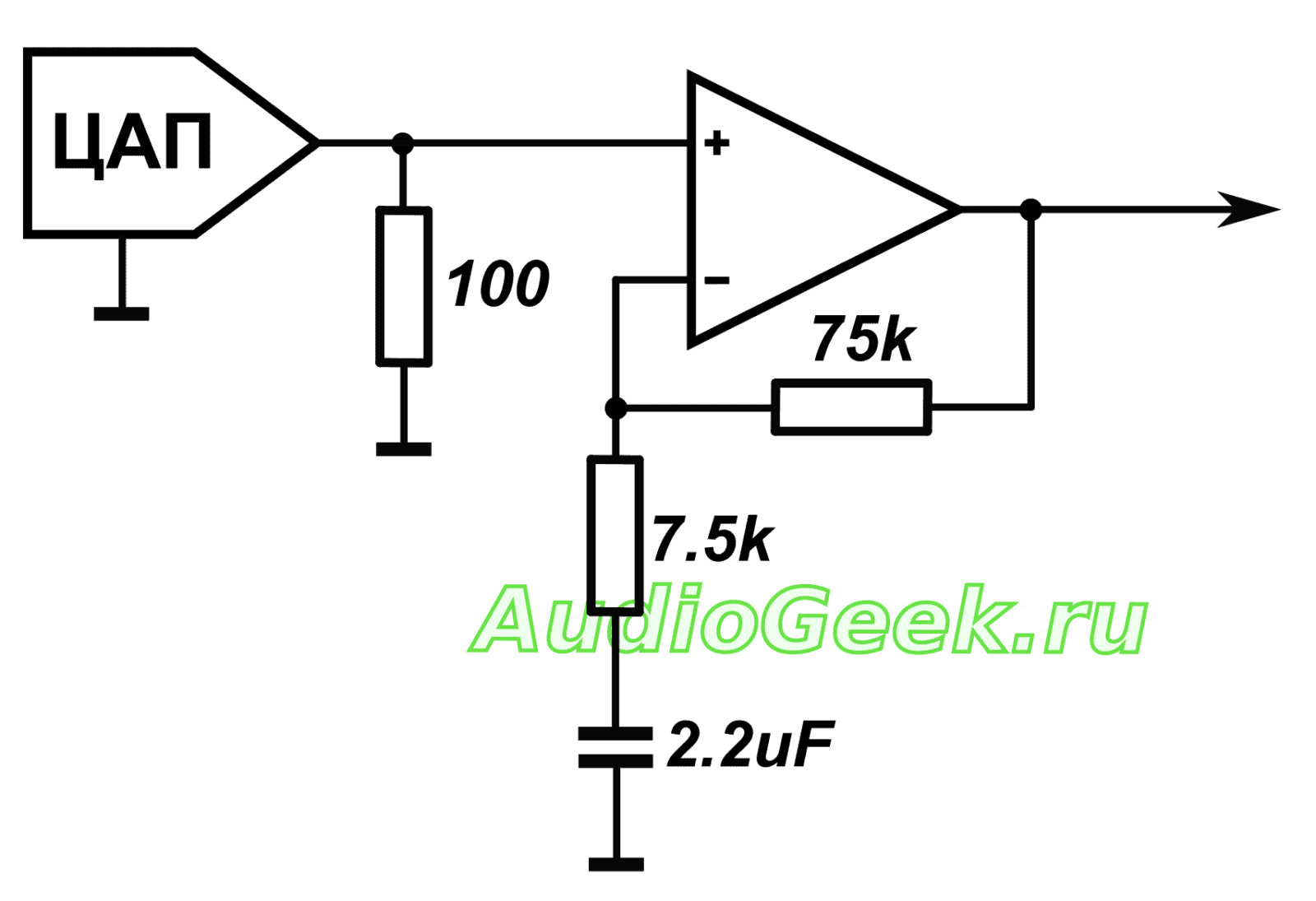 ЦАП можно подключить к нагрузке напрямую, однако, как правило, ставится дополнительный буфер или согласующее устройство. Это может быть неинвертирующий ОУ или повторитель напряжения (см. рис. 6). При использовании буфера следует удостовериться, что он не вносит погрешность больше 1/2 МЗР. При согласовании ОУ с ЦАП следует учитывать и другие параметры ОУ: полосу пропускания, размах напряжения и т.д.