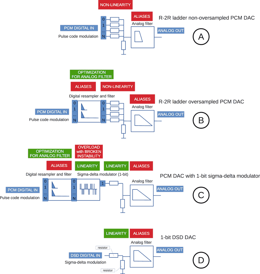 Когда входным цифровым потоком является DSD (1-битная сигма дельта модуляция) вместо PCM, минималистичный DSD DAC содержит пару резисторов и аналоговый фильтр (часть D ).