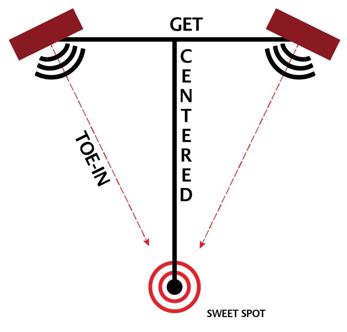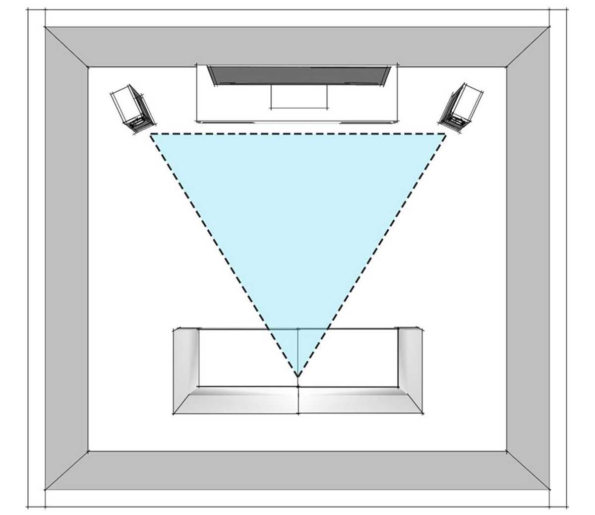 Наконец, мы приблизились к выбору позиции. Идеальная конструкция зоны прослушивания – равносторонний треугольник, ориентированный углом вниз. Расстояние от ушей слушателе до АС и расстояние между колонками должны быть равны или приблизительно равны. Данный пункт является решающим в построении стереообразности, сцены, соблюдения когерентности звучания.
