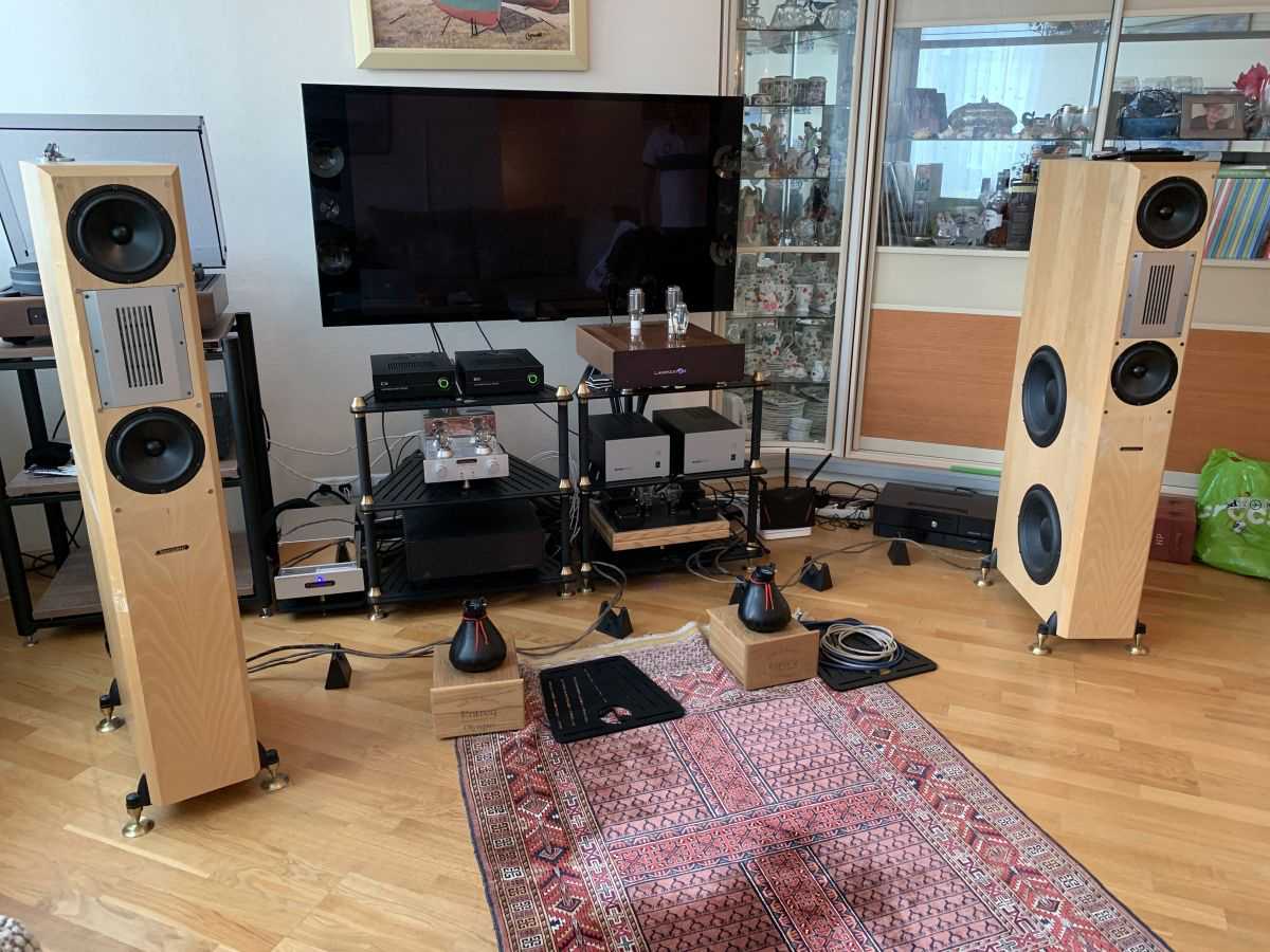 Дополнительные антивибрационные системы не только помогут увеличить высоту акустики и идеально сориентировать высоту твитера. Это станет еще и дополнительным усилением п. 8, благоприятно сказавшись на качестве звучания! Если бюджета нет на фирменные плиты, развязку можно организовать, заказав обычные 5 см. алюминиевые или стальные плиты в размер оснований АС. А вот решения из мрамора зачастую могут навредить.