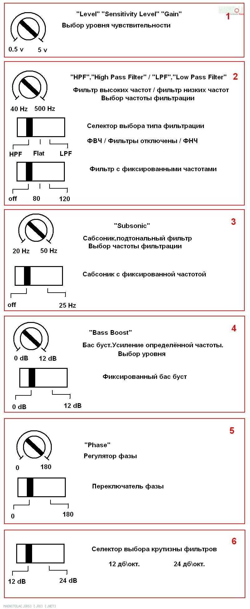 Для сабвуферов и аналогичных им басовых динамиков всё аналогично, за исключнием того, что здесь мы используем ФНЧ, т. е. цель — не дать сабвуферу воспроизводить более высокие частоты. Обычно при настройке выбирают 50-80Гц. Если у вас ФИ корпус, то желательно воспользоваться сабсоником. Если есть регулятор фазы — не пожалейте времени, покрутите его, послушайте. Возможно, в каком либо положении сабвуфер станет играть громче и быстрее.