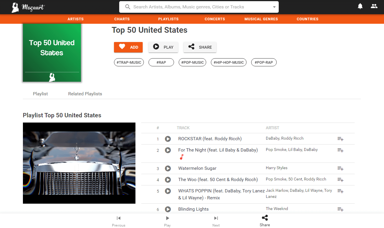 Просматривайте Чарты, чтобы увидеть 50 самых популярных песен в любой стране, или зайдите в Плейлисты для готовых сборников, основанных на жанрах, вашем настроении или на языке исполнения. Одно нажатие иконки Play около нужного трека — и все готово.