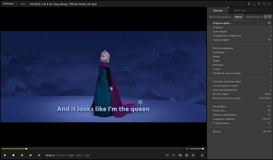 В приложение уже встроен пакет кодеков, так что у вас не возникнет проблем при проигрывании стандартных видеоформатов. При желании можно их отключить и переключиться на системную библиотеку. Дополнительно плеер умеет читать DVD и Blu-ray и автоматически подхватывает субтитры, если они расположены в той же папке, что и сам файл.